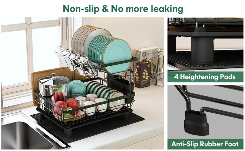 2 Tier Dish Drying Rack with Drainboard Adjustable Spout Utensil Holder and Knife Slots,Space-Saving,Suitable for Kitchen Countertops,Keeps Countertops Clean and Tidy,Easy to Install,Beautifully Crafted,Rotatable Drainage System,Disassembleable