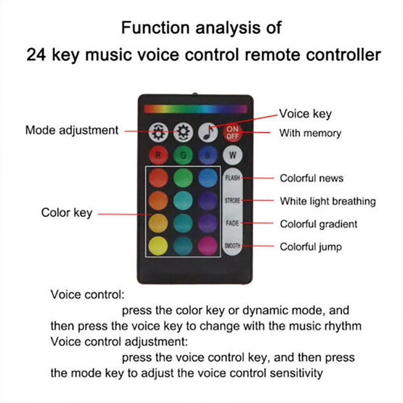 Remoe Control change mode: static 15 color (red, green, blue, yellow, mixed white, pure white, cyan, purple, etc.) and RGB light change, fade, jump, spark and adjust brightness, mode speed and sound sensitivity adjustment.
