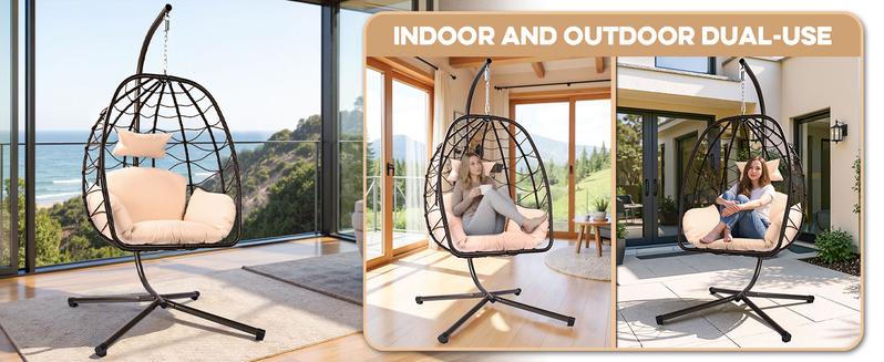 Egg Porch Swing, Hanging Egg Chair for Outdoor Patio with Stand, Waterproof Rattan Wicker Basket Seat, Includes Cushion & Chain, 350Lb Capacity (Beige)