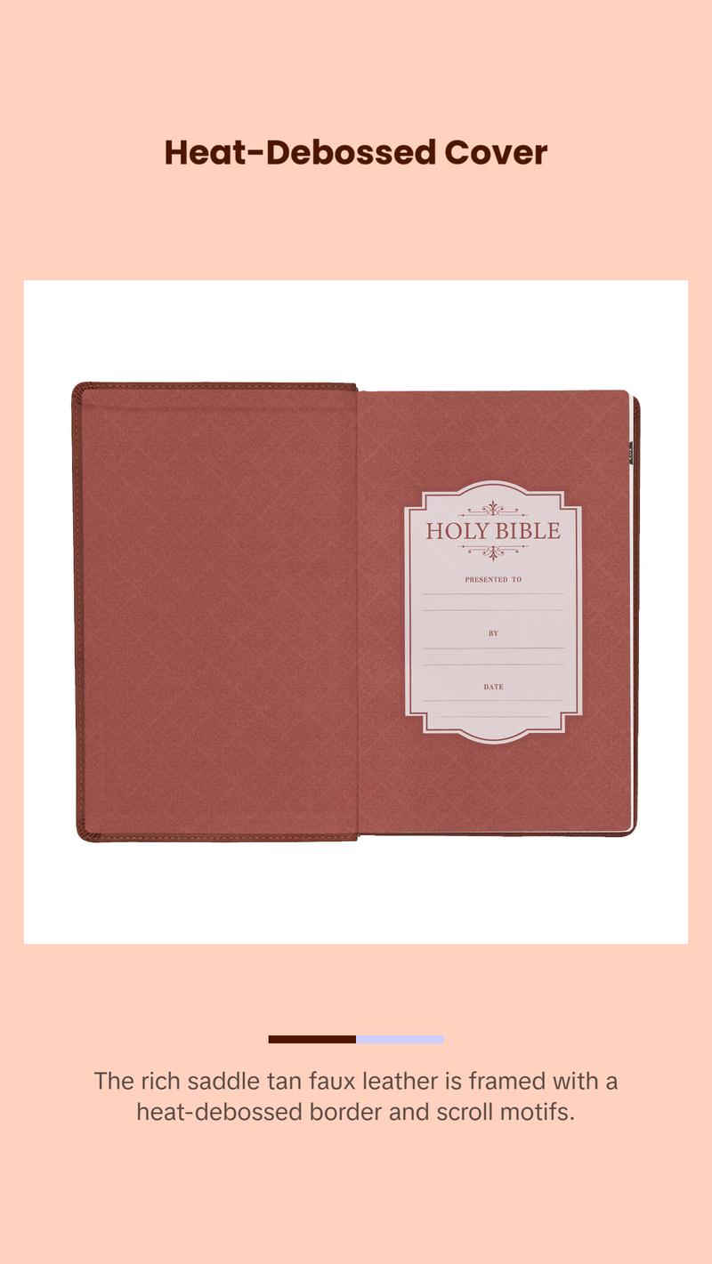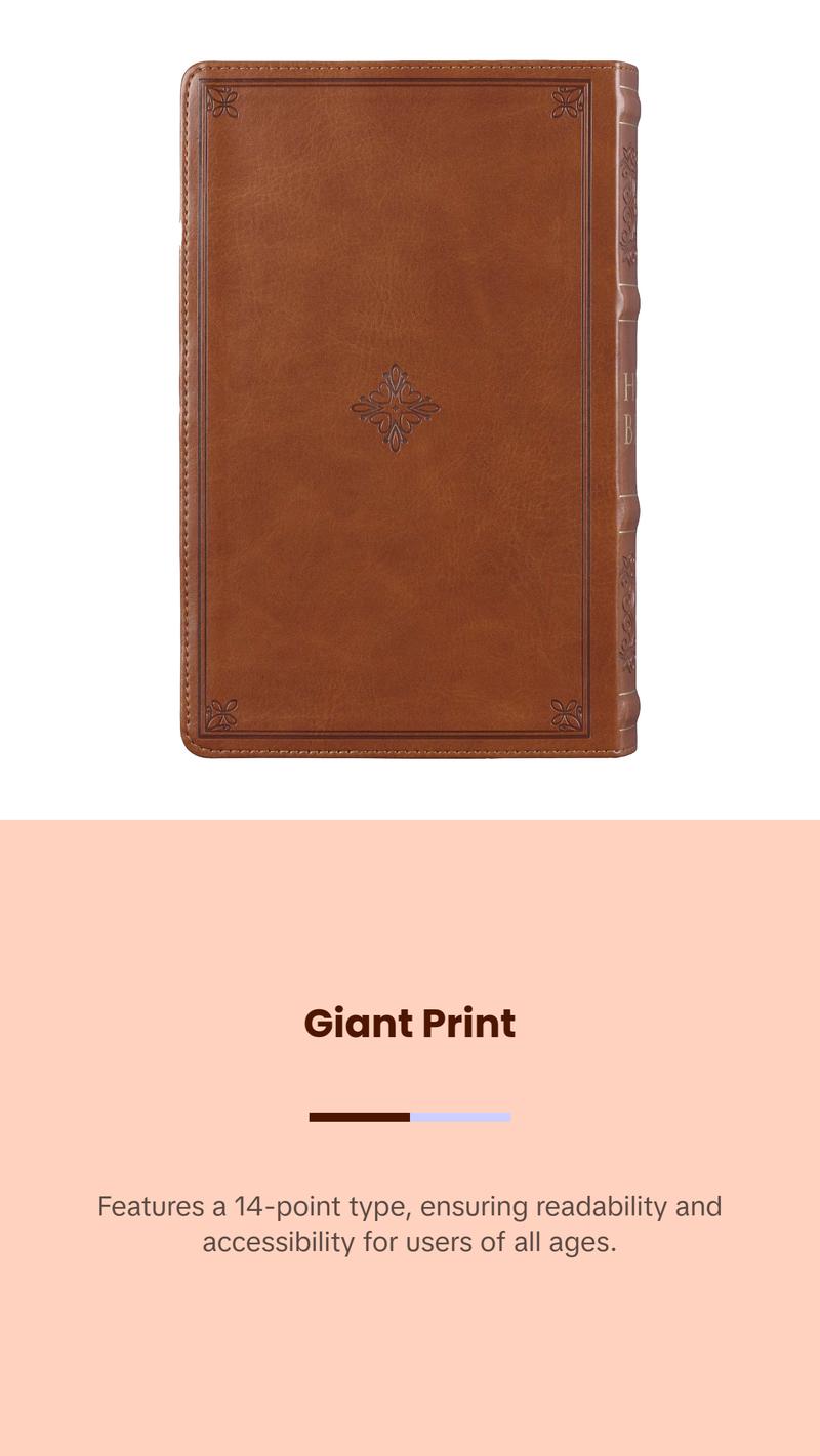 The rich saddle tan cover of the giant print Bible is framed in a heat-debossed border with a corner scroll motif. The scroll motif is repeated in the title design where it sandwiches the gold-foiled title between two heat-debossed scroll flourishes. The gold-foiled version reference is also underscored by a scroll design.