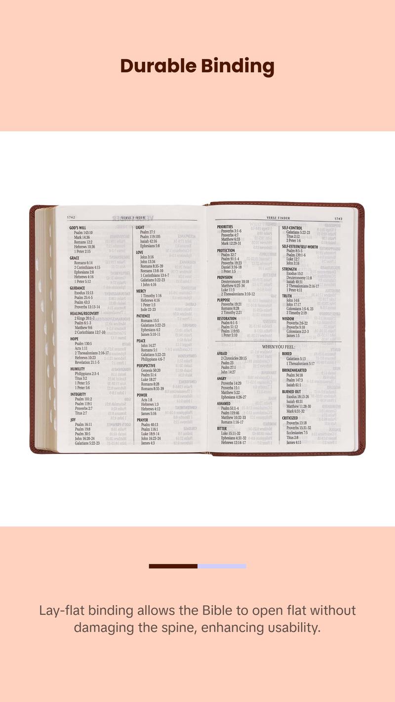 The text has a comfortable 14-point type that makes reading easy and it is presented in double-column format. A lay-flat binding allows the Bible to open flat without damaging the spine. This edition is full of extras to help you study, such as the words of Christ printed in red ink, eight full-color maps, a handy concordance, and a Scripture verse finder organized by theme. The Bible also has cross-referencing, thumb indexing, and a reading plan that will lead you through the entire Bible in one year.